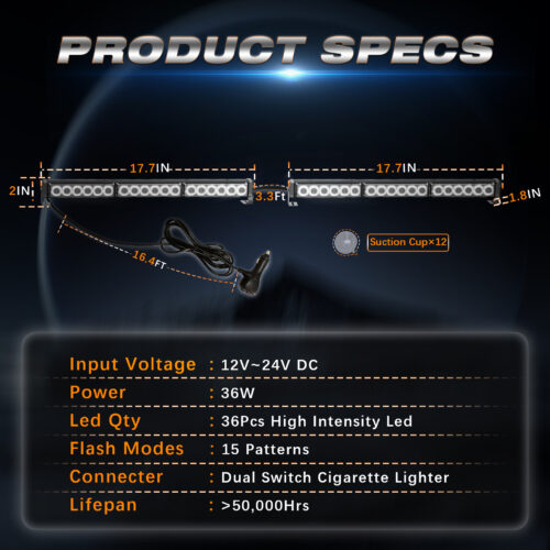 [Versatile] Safety strobe light bar can be adapted not only for different vehicles such as trucks,safety vehicles, snow plows,trailers and tractors.And it can be installed in different locations on the car,such as the interior front/rear windshield,sun visor,deck and dashboard,and even the exterior roof lights.