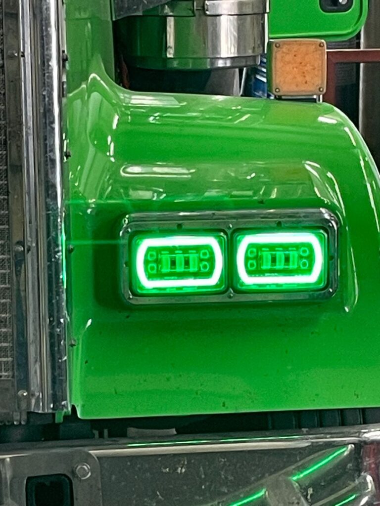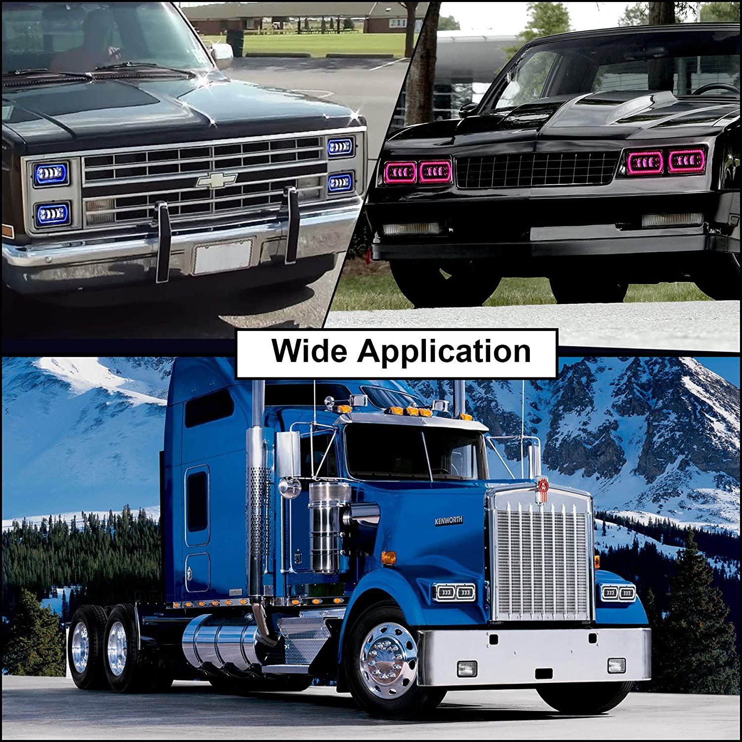 - Upgrade RGB Halo Angel Eyes: RGB 16 Million Colors & blue tooth controlled & iPhone and Android compatible & timing function & music mode & flashing function & manual control unlimited colors options and functions (blinking, flashing, brightness, etc); The halo also can be chosen WHITE color when you driving on the country road or highway, giving your truck Peterbilt Kenworth headlights a unique appearance.